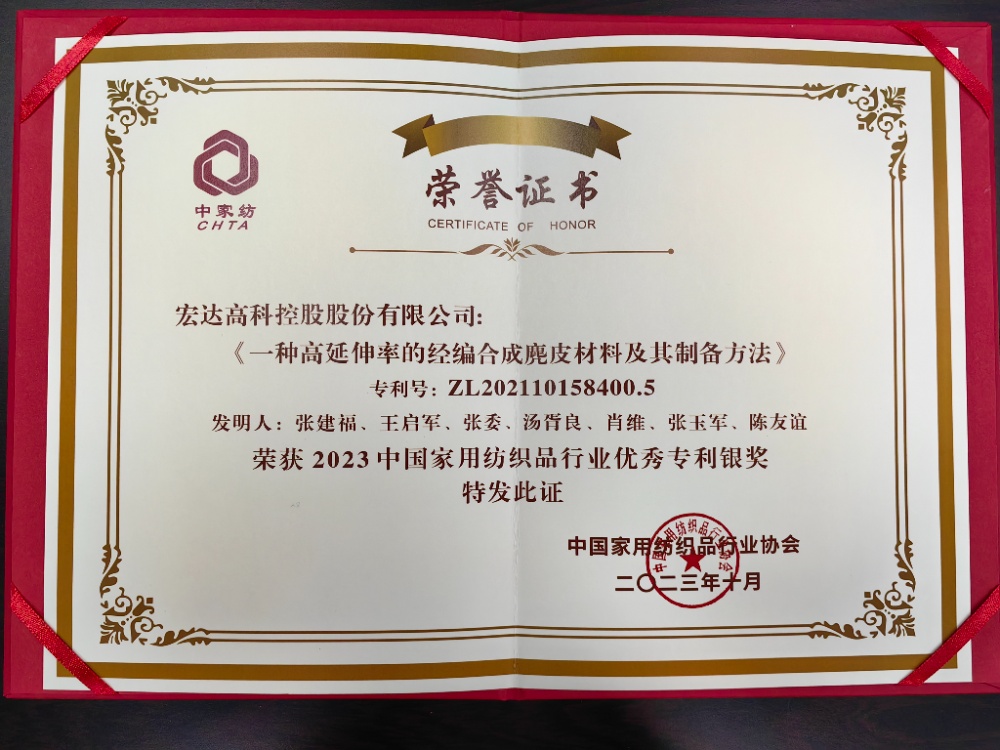 為激發行業創新活力,挖掘行業創新潛能,2023年10月,中國家用紡織品行業協會相繼開展了2023年家紡行業優秀“科技+家紡”論文(案例)征集活動、2023年中國家紡行業優秀專利征集活動,經評選,宏達高科控股股份有限公司提交的《一種高延伸率的經編合成麂皮材料及其制備方法》專利榮獲“2023中國家用紡織品行業優秀專利銀獎”。