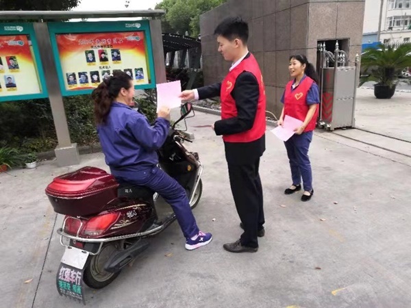 每天臨近下班,宏達高科黨員志愿者們已提前來到公司生產區門口,他們身穿志愿者標志的紅馬甲,手拿交通文明宣傳傳單,分發給進出廠區的員工,并為員工的電瓶車貼上“平安許村”的反光膜,提醒員工們開車注意安全,不要在行駛過程中猛轉彎,開電瓶車必須佩戴頭盔等方面的安全知識。