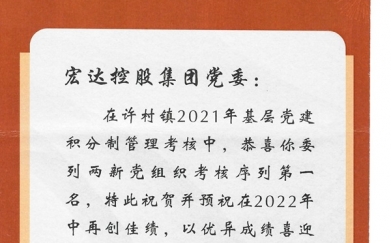 宏達控股集團黨委在許村鎮(zhèn)2021年基層黨建積分制管理考核中,委列兩新黨組..