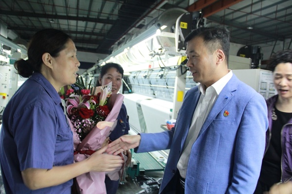 在宏達(dá)高科,朱書記來(lái)到經(jīng)編車間,慰問(wèn)了全國(guó)勞動(dòng)模范何娟鳳、嘉興市、海寧市勞動(dòng)模范趙巧娟。何娟鳳和趙巧娟都是宏達(dá)高科的普通一線員工。十幾年來(lái),她們?cè)趰徫簧锨谇趹⒖嗑毤寄堋F渲汹w巧娟曾被評(píng)為全國(guó)紡織工業(yè)技術(shù)能手,也是嘉興市最美職工。朱書記說(shuō),這樣的榮譽(yù)來(lái)之不易,并勉勵(lì)她們?cè)趰徫焕^續(xù)努力,進(jìn)一步弘揚(yáng)工匠精神。